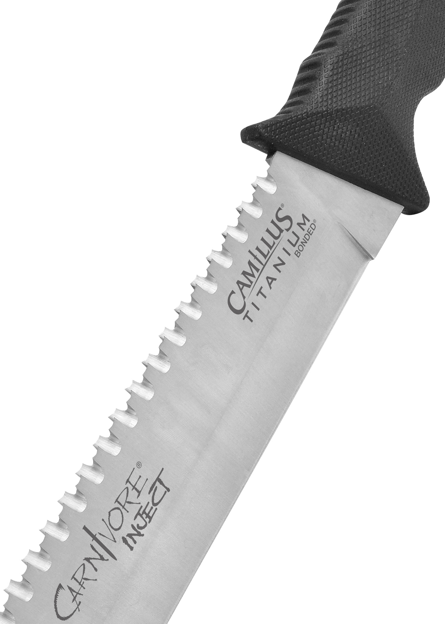 Die insgesamt 45,7 cm lange Camillus CARNIVORE INJECT Machete mit durchgehendem Erl liegt dank ihres ergonomischen, aufgerauten Griffes aus schwarzem ABS Kunststoff mit Fingermulden hervorragend in der Hand. Die etwa 30,5 cm lange Klinge mit Hohlschliff aus rostfreiem 420 Stahl ist dank des zusätzlich angewendeten Titanium Bonded Verfahrens besonders korrosionsbeständig und bleibt durch die zusätzlich verliehene Härte länger scharf. Auf dem Klingenrücken befindet sich neben einem geschliffenen Widerhaken ein etwa 21 cm langer Sägeschliff, wodurch die Machete auch zum Sägen genutzt werden kann.