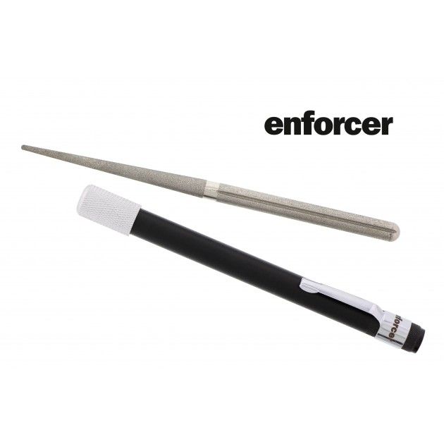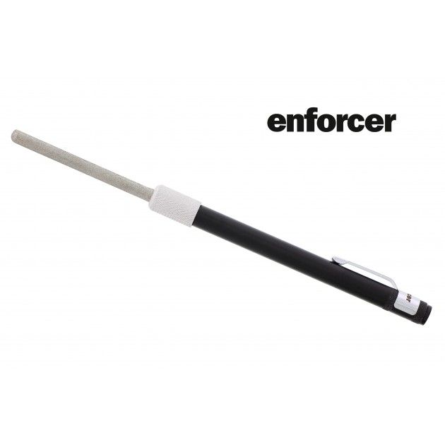 Der enforcer Diamantschärfer ist auch einsetzbar für Messer mit Wellenschliff. Eine Längsrille im Schärfstab dient zum Nachschärfen von Angelhaken. Je nach Bedarf wird der zweiseitige Schärfstab in der Halterung gedreht und mittels der Feststellschraube befestigt. Der enforcer Diamantschärfer sollte in keinem Haushalt oder Angelkasten fehlen.