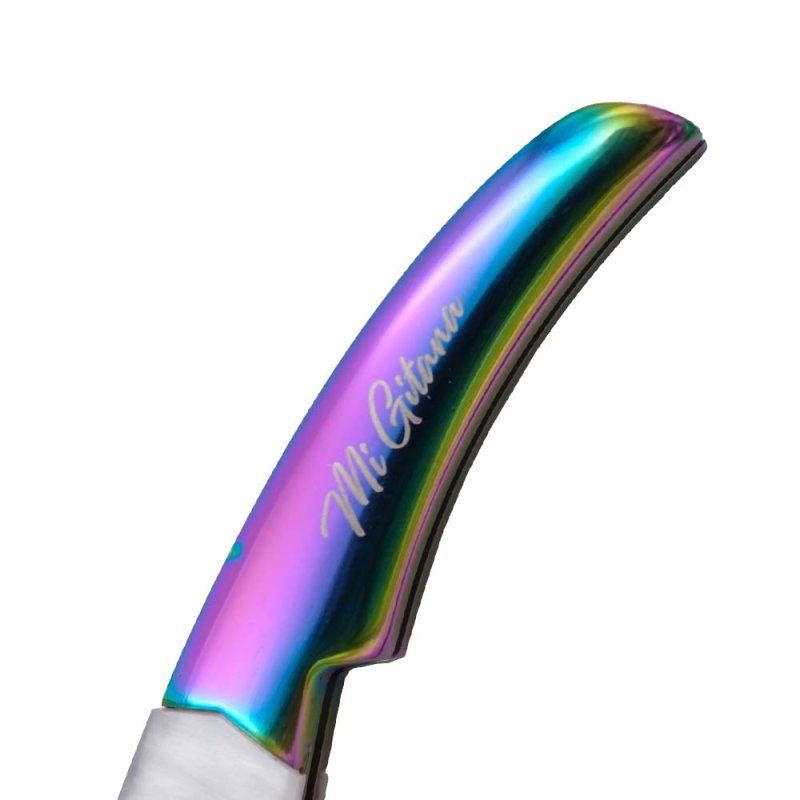 Die 11 cm lange Klinge aus 440er Stahl ist ebenfalls Titan-Rainbow-beschichtet und hochglanzpoliert, während Feder und verzierte Hebelstange das Gesamtbild harmonisch abrunden. Mit einer Gesamtlänge von 24 cm, Grifflänge von 13 cm und einem Gewicht von 105 g liegt das Messer perfekt in der Hand.