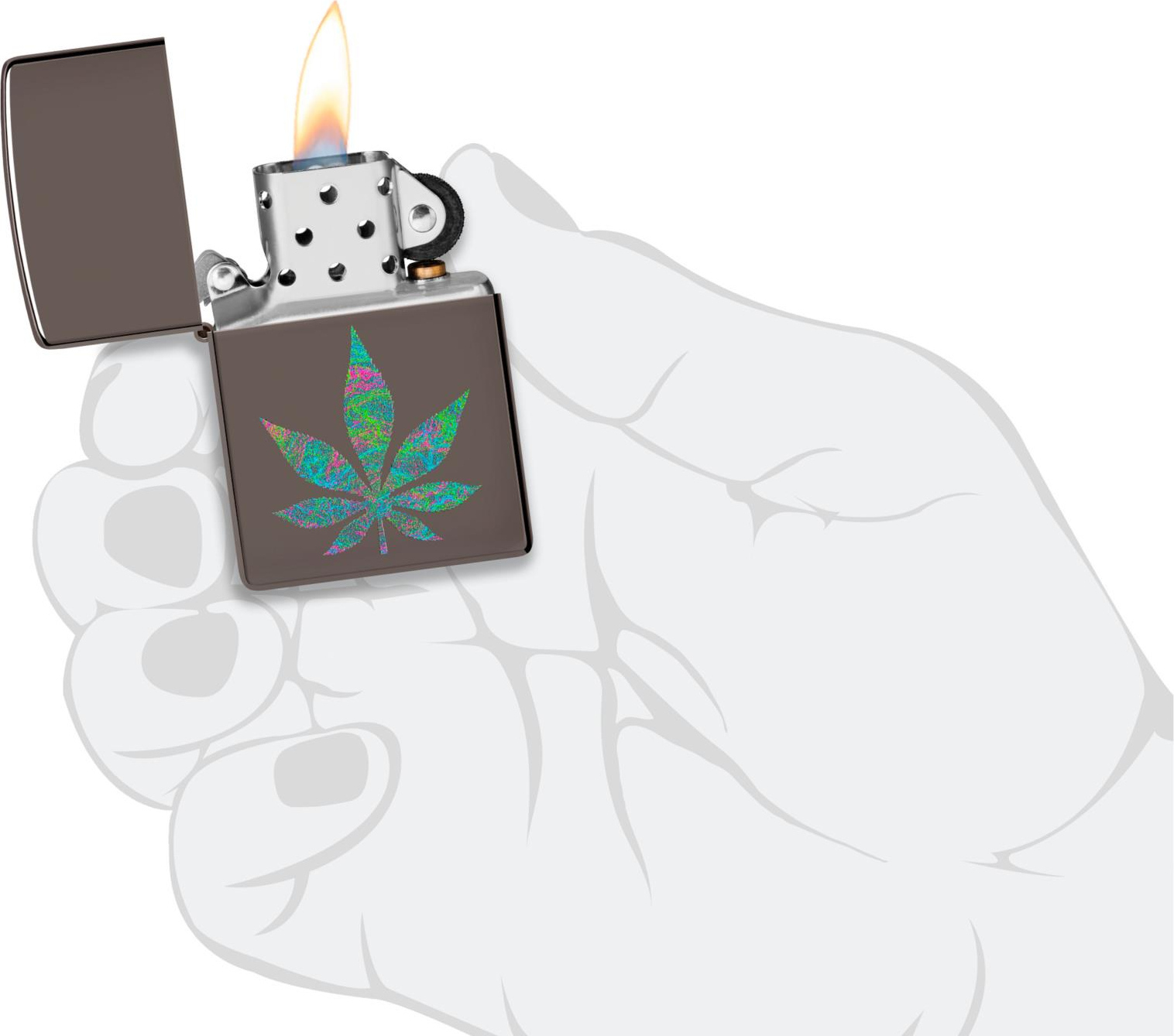 Originales Zippo Benzinfeuerzeug im Black Ice Finish mit buntem „Funky Cannabis“ Motiv.